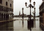 いよいよベネチアの町へ入りました。そして、ホテルへ水上バスで移動しようとしたのですが、水位が高くボートが橋の下をくぐれないので、かなりの時間待たされました。まさに、水の都と言うことでしょうか。 こんな時に来られたのはラッキーでした。右の写真は、黒いゴミ袋を足にかぶせて、長靴代わりにして歩いている観光客です。 |